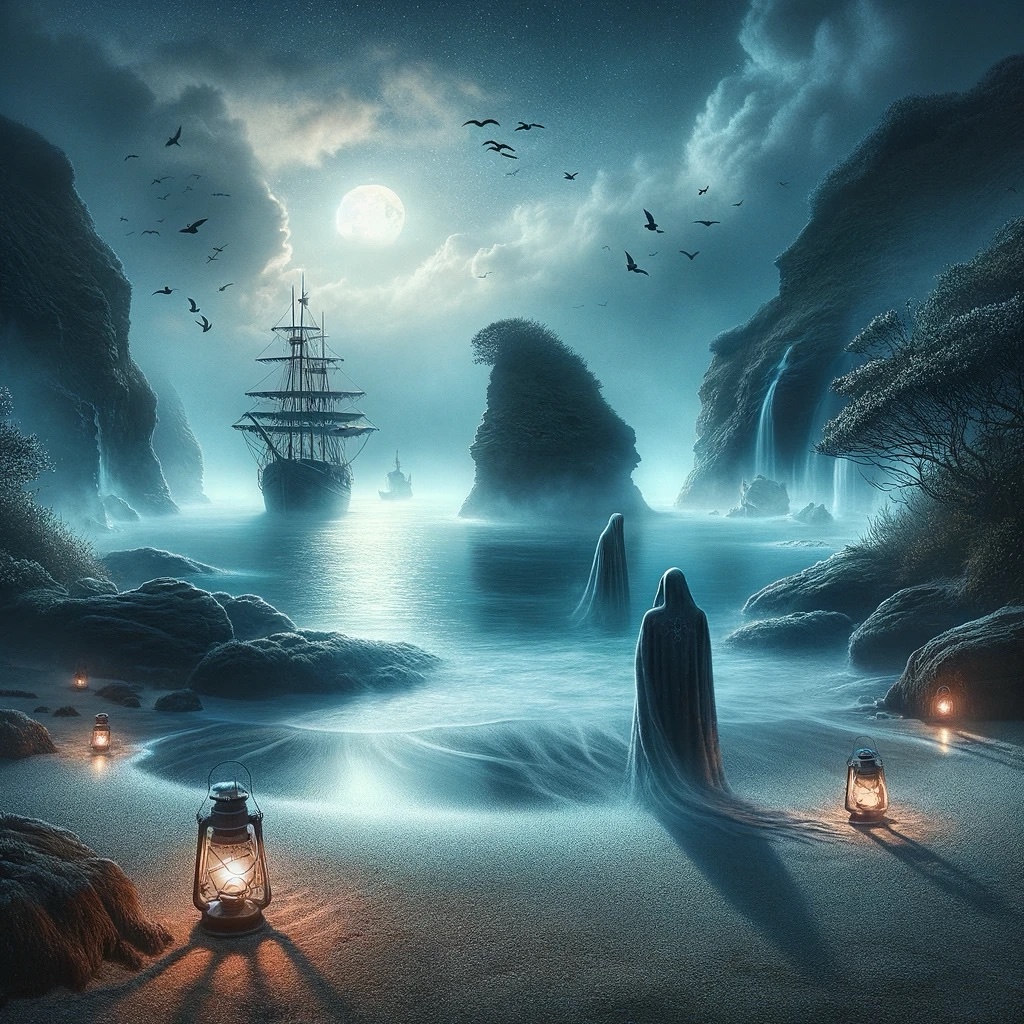 (Softly) Moonlight weaves on silvered sands, Guiding souls to these haunt’d lands, A haven for the hearts pursued, Wrapped in midnight’s tranquil brood. (Belting out) Each wave a whisper, each gale a friend, In the eternal embrace of Merrow’s End.